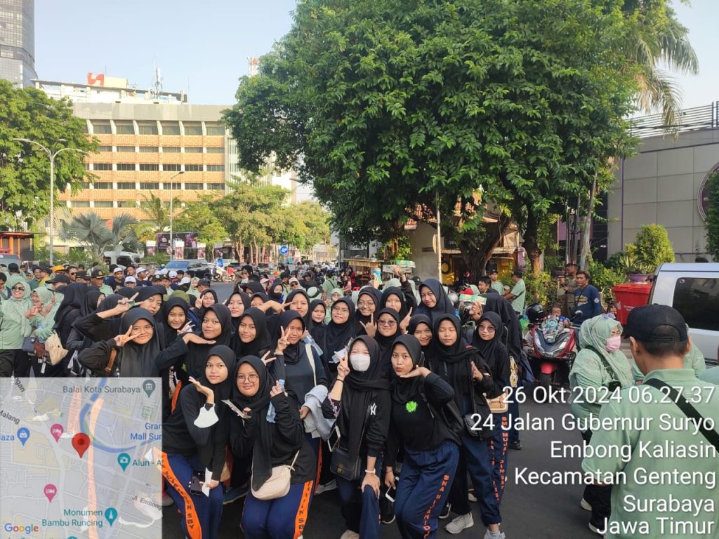 Yo, gengs! Sabtu pagi yang cerah, SMA Mujahidin Surabaya kirim 50 siswi keren-keren dari kelas X, XI, dan XII buat ikut jalan sehat peringatan Hari Santri.