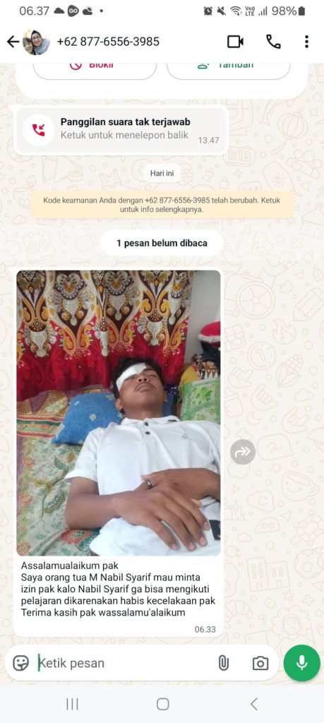"Assalamu 'alaikum, Pak. Saya orang tua M. Nabil Syarif mau minta idzin pak kalo Nabil Syarif gak bisa mengikuti pelajaran dikarenakan habis kecelakaan pak. Terima kasih pak wassalamu 'alaikum," begitu pesan WA yang masuk ke guru BK SMADIN, Agus Wiji pagi ini pk 06.30 WIB.